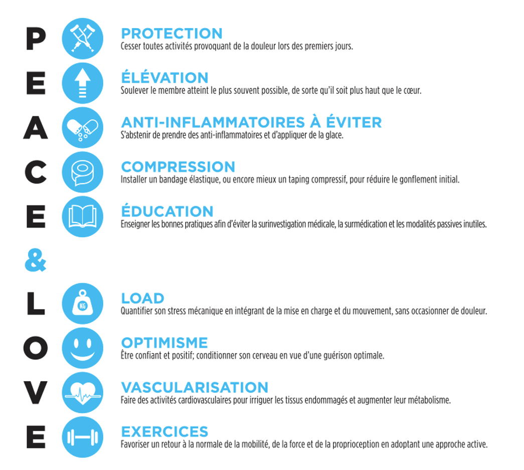 Récemment, la manière d’aborder la prise en charge des blessures aigües de l’appareil musculo-squelettique a sensiblement évolué. En effet, depuis les années 80, les professionnels de santé abordent ce genre de lésions avec un protocole bien connu : le RICE. Il s’agit de l’acronyme pour : Rest – Ice – Compression – Elevation. Ce protocole a servi de manière efficace pendant de nombreuses années mais ne tient actuellement plus compte des avancées scientifiques dans le domaine et se limite uniquement à la prise en charge dans les premiers jours suivant la lésion. Désormais, un nouvel acronyme actualisé a vu le jour : PEACE and LOVE. Détaillons-le ensemble.
